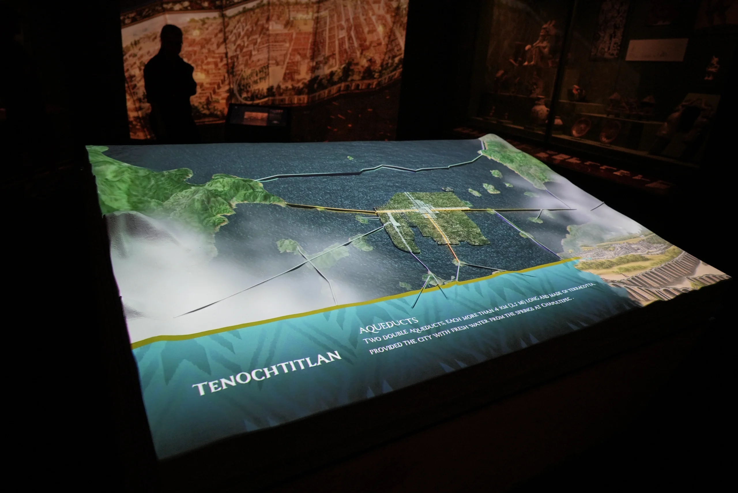Experience a large-scale Diorama Projection that offers a zoomed-out view of the ancient city of Tenochtitlan. See the ceremonial center and pyramids in relation to the surrounding lake system, along with the network of causeways connecting the island to the mainland. This display emphasizes the layout and placement of key structures and geographical features, offering a broad overview of the city's transformation from its peak as a major empire to its early colonial mapping.